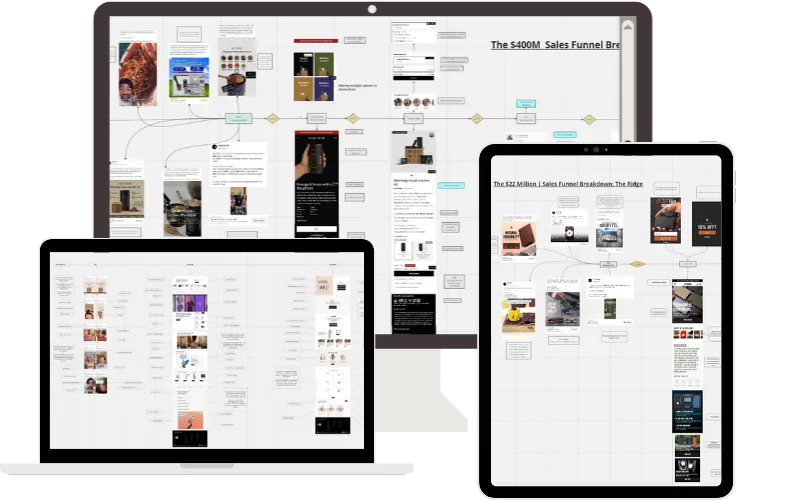 This funnel playbook isn’t just theory. It’s built from actual research, ad data, and live funnel breakdowns of brands doing $10M–$100M/year. I mapped them visually into one board so you can model what’s working right now.